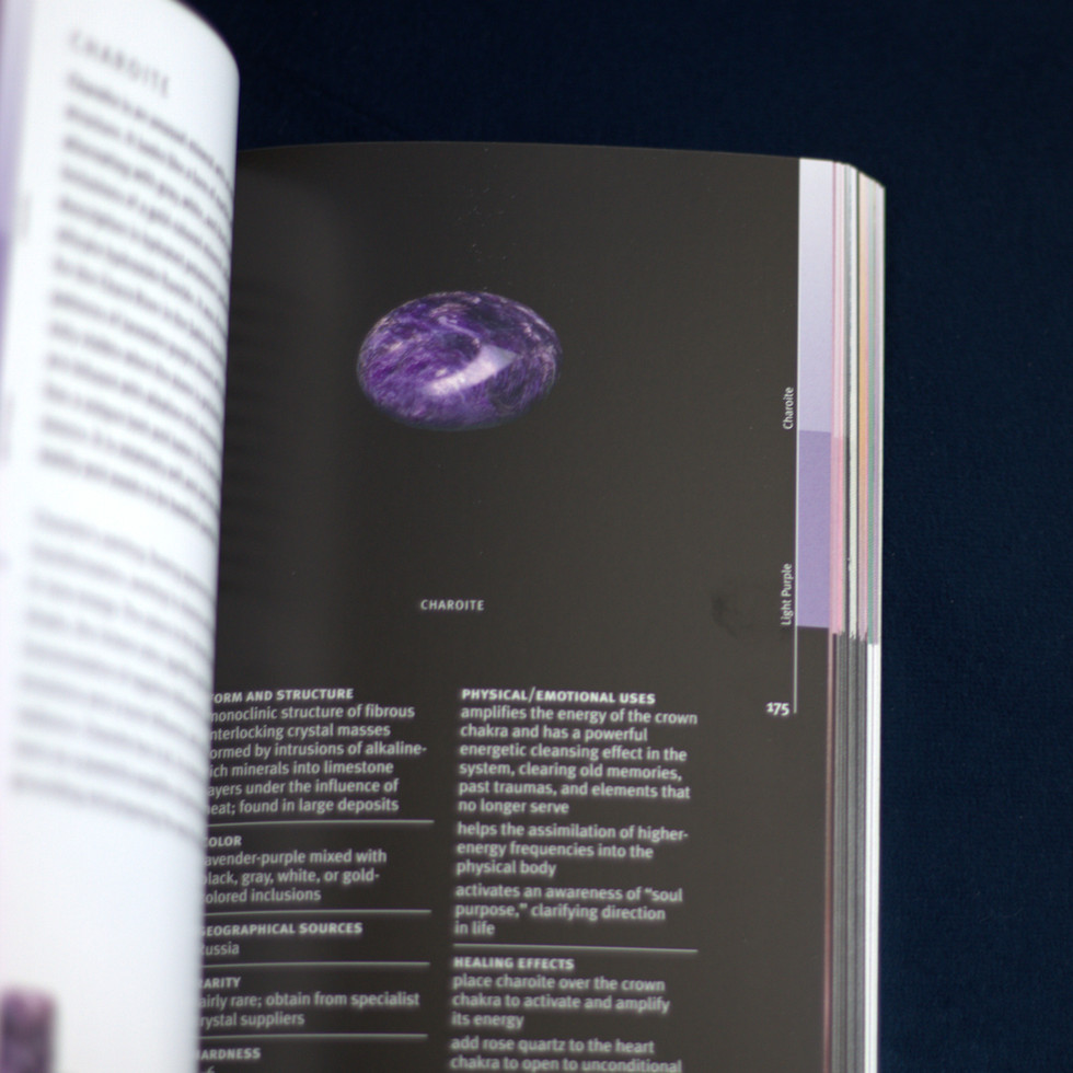 A magnificent crystal identifier profiling over 100 of the earth's most fascinating and beautiful minerals displayed in a spectrum of 20 color bands. Explore the significance of each color ray, and the crystals that it encompasses, along with a factual reference describing the form, source, and rarity of the stones. Expert guidance on the placement and use of crystals means that you can use crystal healing at home. Stunning images printed on a glossy black background fully capture the innate luminescence of each crystal.